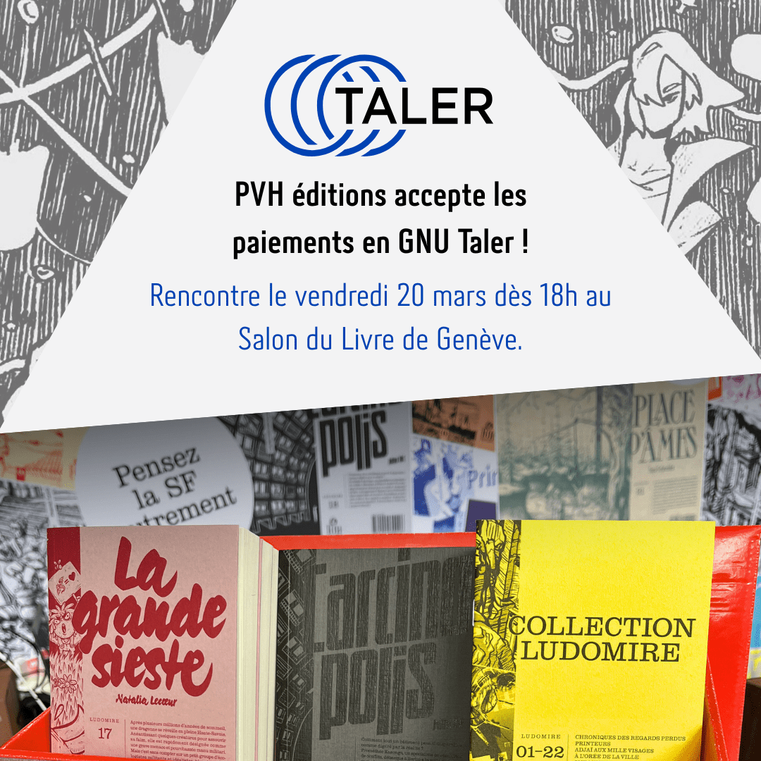<img src=“https://pixelfed.ch/storage/m/_v2/775468063685939826/a1431798c-70628a/mR0UJlAgX76H/gF5VDWSSjNZ4cbOskqAd5MJ9eCq2Uv8HWG3BSA3h.png” alt=“Le logo de GNU Taler est accompagné du texte “PVH éditions accepte les paiements en GNU Taler. Rencontre le vendredi 20 mars dès 18h au Salon du Livre de Genève” et d’une photo du présentoir de PVH éditions.”/>