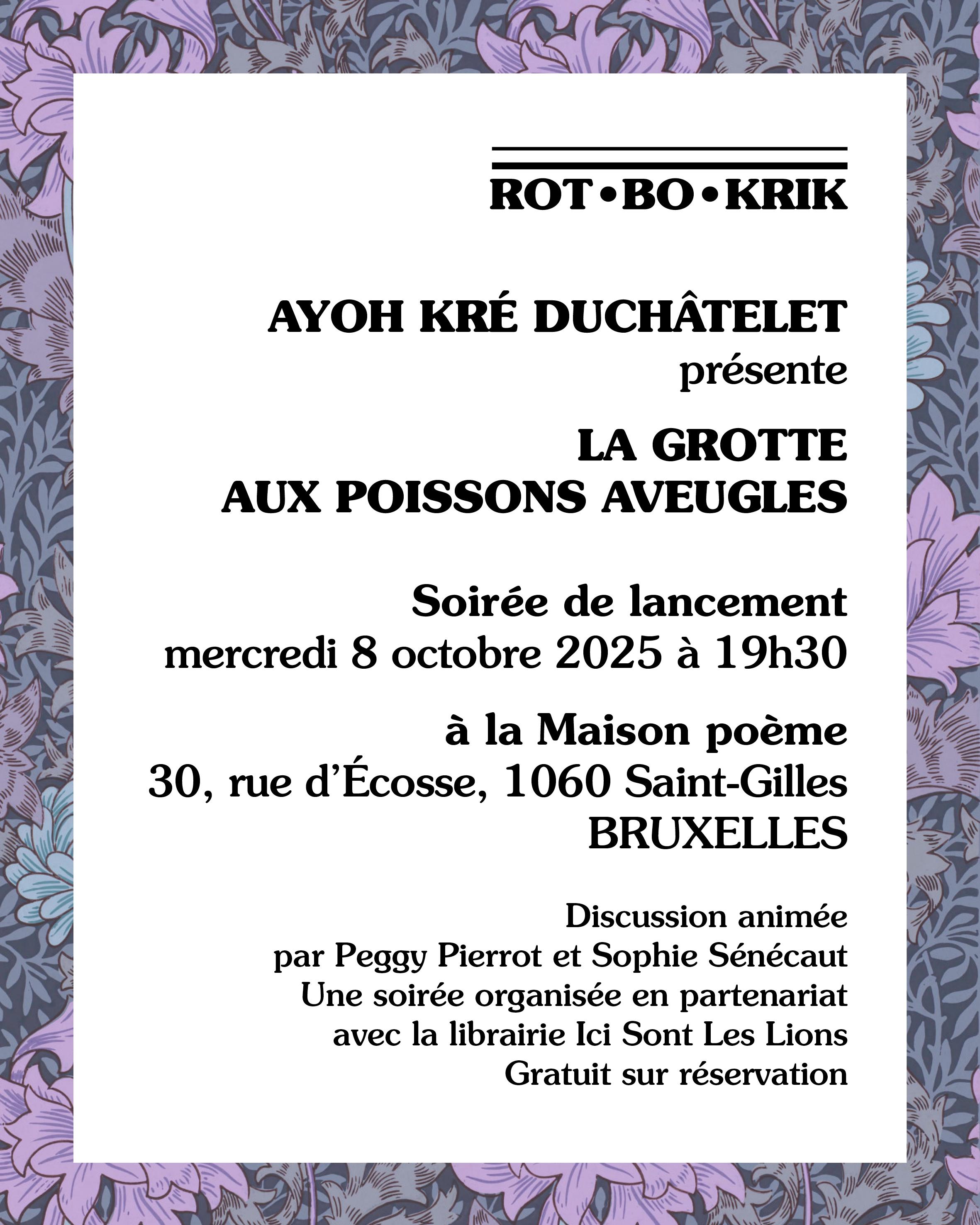 La Maison poème de Saint-Gilles, à Bruxelles, nous fait l’amitié d’accueillir mercredi 8 octobre la soirée de lancement du livre. La discussion sera menée par la chercheuse Peggy Pierrot et l’artiste Sophie Sénécaut. L’événement est organisé en partenariat avec la librairie Ici Sont les Lions.